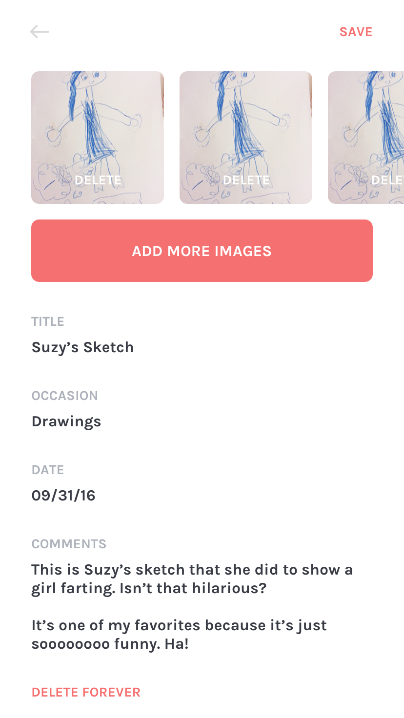 The goal with this project is to see it developed into a fully functioning app and be able to use it instead of feeling guilty for storing or throwing away old cards and momentos.