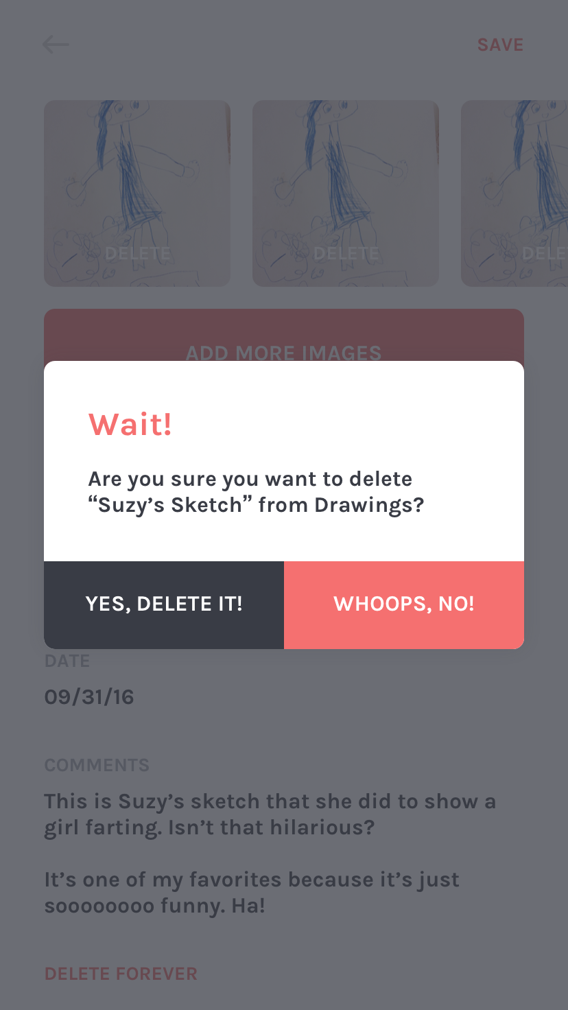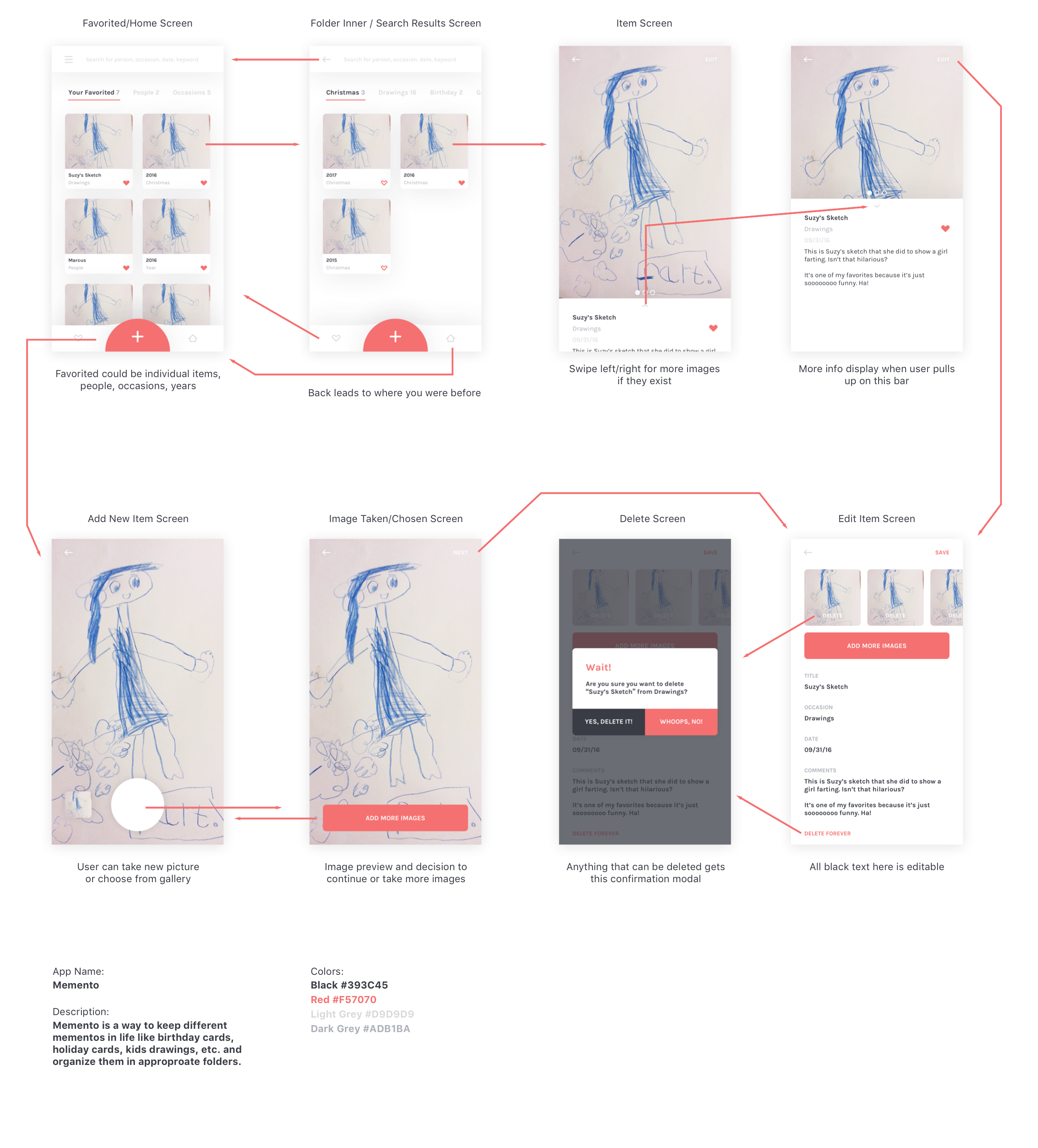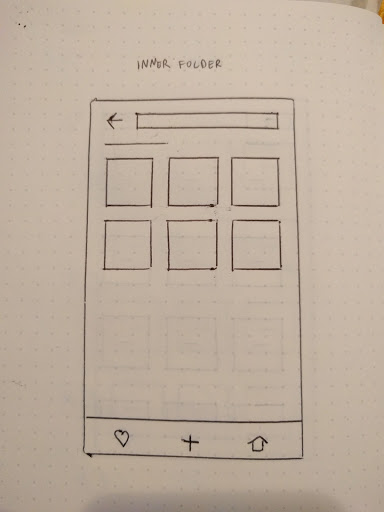 Once we had our core functionality documented, I began sketching wireframes for the different pages and actions inside the app. During this phase we discovered how momentos could be organized, how easy it should be to create a new momento, and how to quickly find the momentos you've already created.